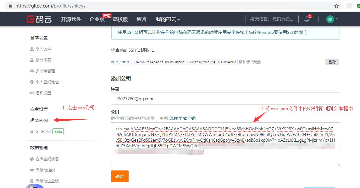 E.打开id_rsa.pub文件,复制文件中的所有代码,点击码云中的SSH公钥,将生成的公钥复制到公钥中