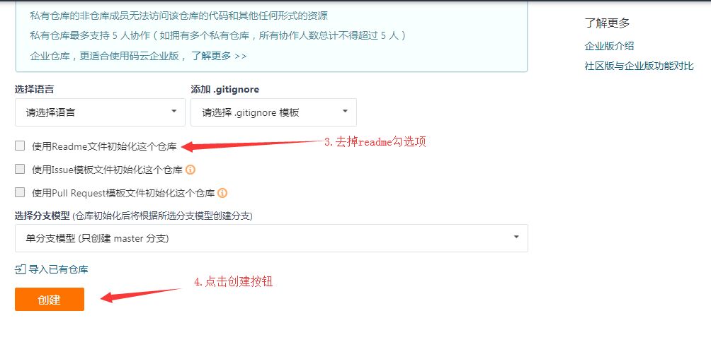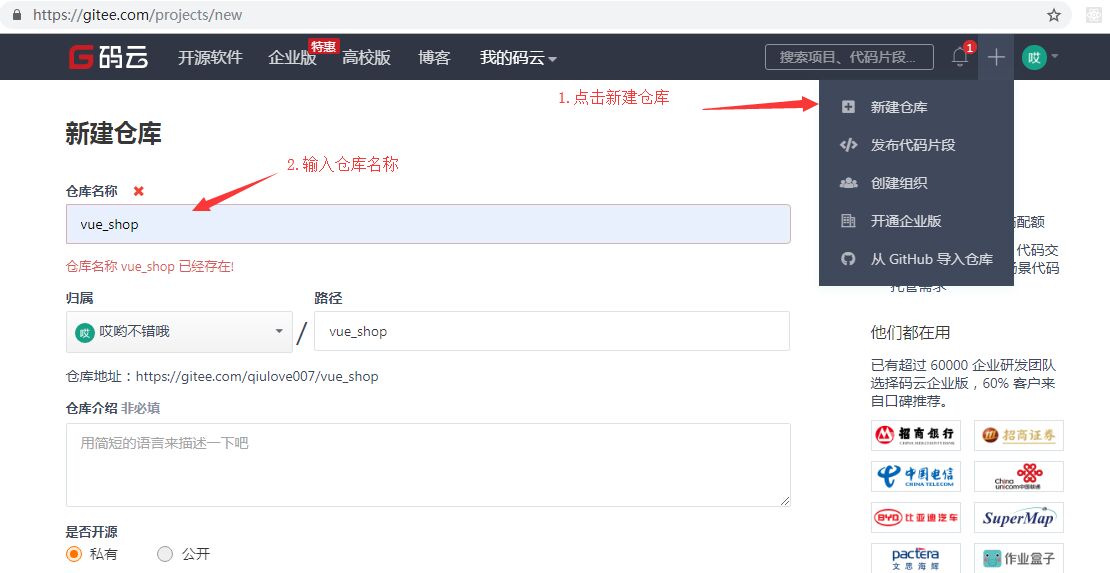 3.7 将本地代码托管到码云中 点击码云右上角的+号->新建仓库