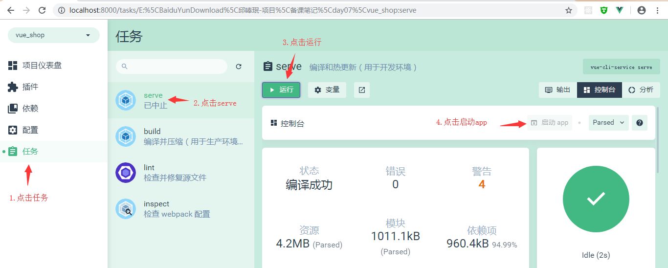 然后执行vue ui命令打开ui界面,然后运行serve,运行app查看当前项目效果